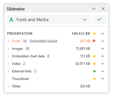 PowerPoint files can get pretty big, especially if you add in lots of high-quality media like pictures, sound clips, and videos. However, other elements can also drive up the size. PowerPoint itself won't tell you exactly what's making your file so big, but Slidewise's "Fonts and Media" view is super helpful. It gives you a precise breakdown of where all that size is coming from, so you know exactly which elements are taking up the most space.
