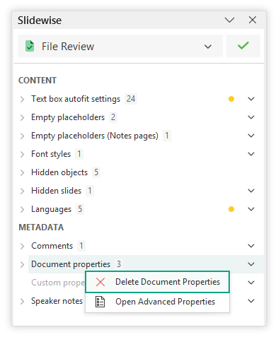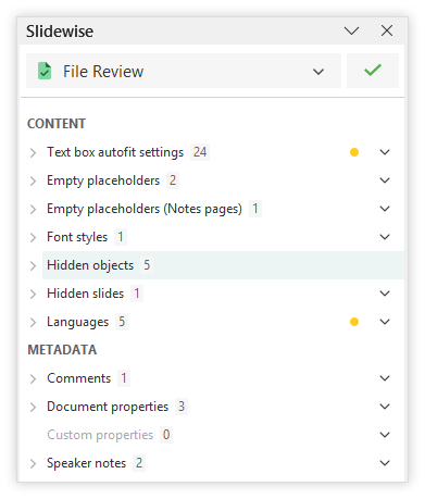 In the "File Review" view, you'll find various quality issues, particularly hidden or background objects and data, which are our focus. A number next to each content or metadata type indicates its count within the presentation; for instance, there are 5 "Hidden objects" in the example below.