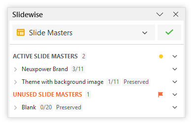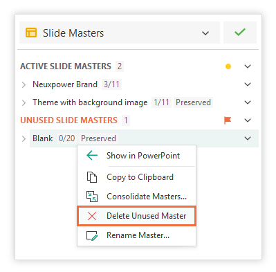Extra masters can, at a minimum, increase your file size unnecessarily. They can also contain unwanted fonts, sensitive data, etc. so if they aren’t needed, simply right-click on them and choose “Delete Unused Master”. Alternatively, right-click on the heading to delete all of them at once. Our support site has more information on managing your masters and layouts with Slidewise.