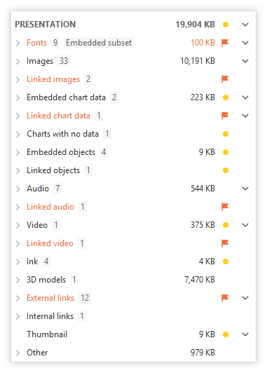 Slidewise automatically scans your file and conveniently lists all links in the "Fonts and Media" view. For instance, the example below shows how Slidewise groups linked files into categories such as “Linked images”, “Linked chart data”, “Linked objects”, “Linked audio”, and “Linked video”. Web hyperlinks are gathered at the bottom of the index under the "External links" heading.