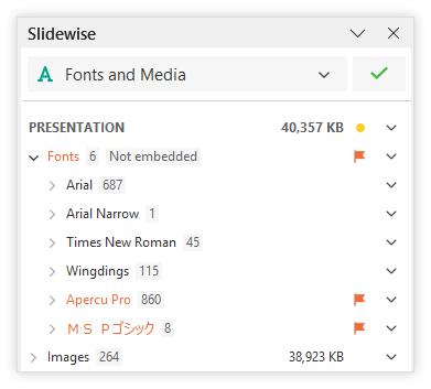 There is no central place in PowerPoint to view a list of all fonts used in your presentation, which makes it difficult to manage. Slidewise is the only way to see all the fonts used in a presentation. It shows you which fonts are used, where they are used, whether they are embedded and their corresponding file size.