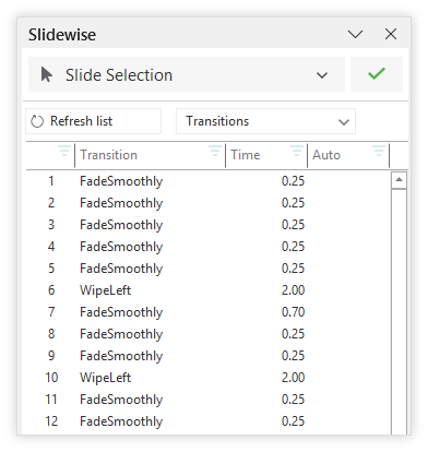 PowerPoint's "Slide Sorter" view allows you to see if a slide has a transition, but it doesn't give you an overview of the specific transitions and timings used across all slides. Slidewise, however, does. To access this, switch Slidewise to the “Slide Selection” view and choose "Transitions" from the dropdown menu. This will display a list of every slide in your presentation, along with any transitions, for easy review. You can select any transitions you wish to edit, and Slidewise will then select the corresponding slides and switch you to the Transitions tab. Make your changes using the PowerPoint Ribbon tools, and then refresh Slidewise to see the updated details.