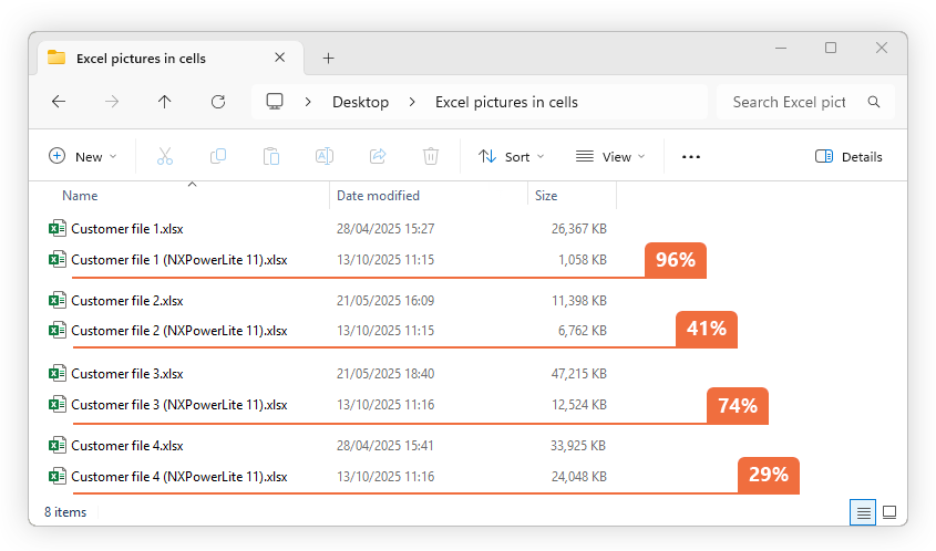 Here are some example files, shared by customers, demonstrating the significant compression achieved with our latest engine. None of these files can be compressed with NXPowerLite v10 or Excel’s Compress Pictures feature.