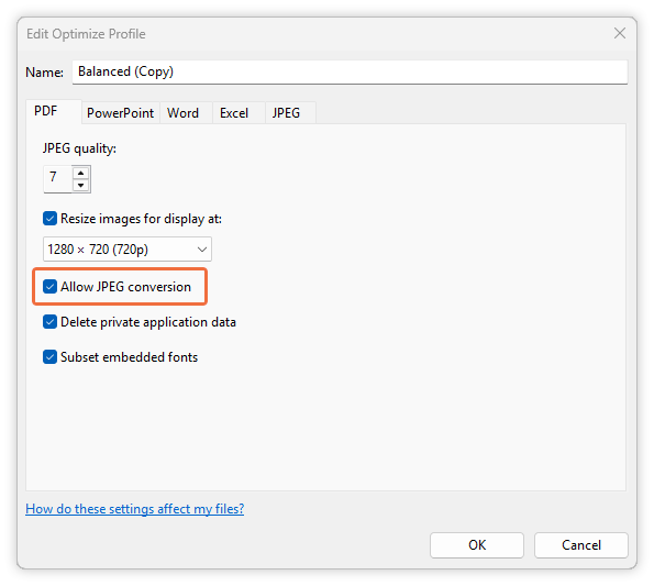 There isn’t a separate setting to enable/disable this, as it is now enabled by default with the “Allow JPEG conversion” setting in NXPowerLite’s PDF files tab.
