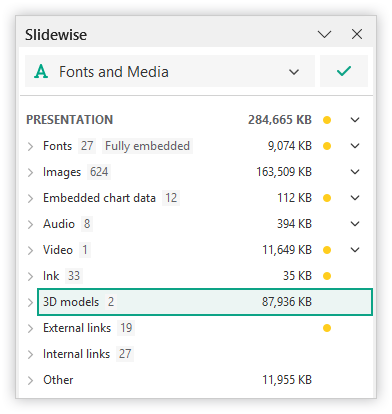 Open your PowerPoint file and click to open Slidewise. It will display a complete index of the content in your file, with the associated file sizes. In this example below, you can easily see that there are two 3D models accounting for almost 88 MB. If you expand that in the tree you can double-click on the models to jump to them in PowerPoint.