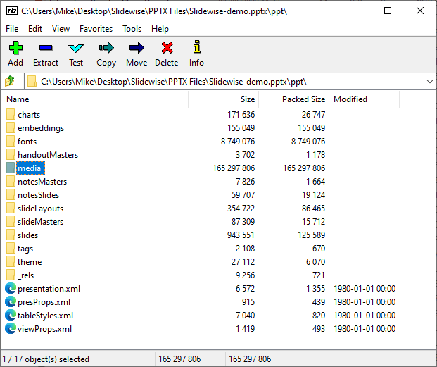 When 7-Zip opens, you will see an Explorer-like view, where you can browse through the folders to see where the large content is lurking. The names of the folders should be pretty clear. In this example the main size is located in the media folder which contains the images, audio and video files. There is also some bulk in the fonts folder as well.
