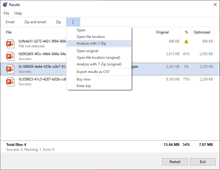 From the NXPowerLite results screen you can now right-click on any Office file (PPTX, DOCX or XLSX) and select Analyze with 7-Zip. This will open the optimized file in 7-Zip, allowing you navigate through contents to quickly see where the heavy media is hiding.